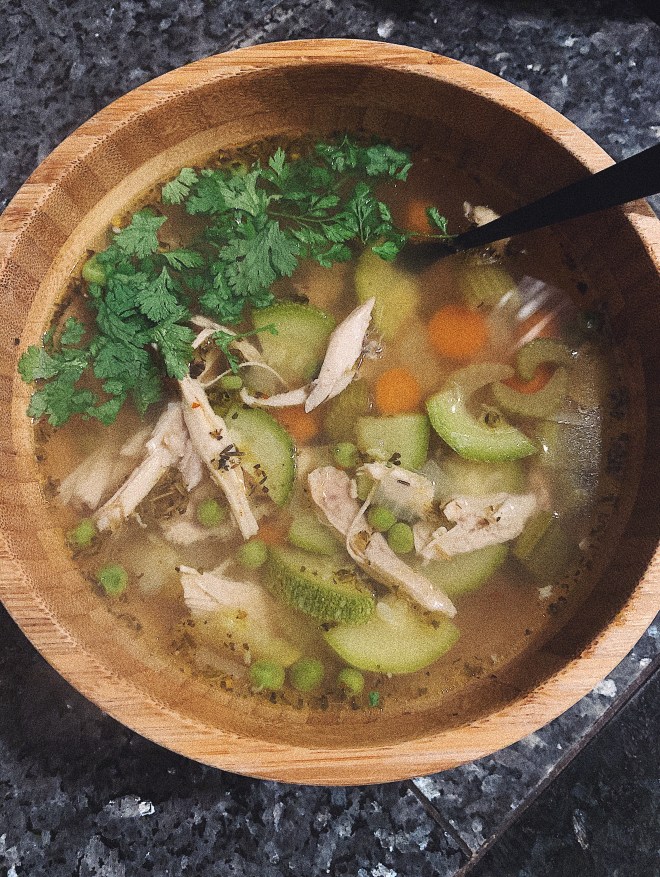 - Chop your veggies. Add onion, carrots, celery, and garlic. Add all seasonings (pepper, Himalayan salt, oregano, basil, rosemary, thyme, and bay leaves). Bring to a simmer. Give everything a stir and walk away. Come back in about an hour and a half.